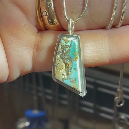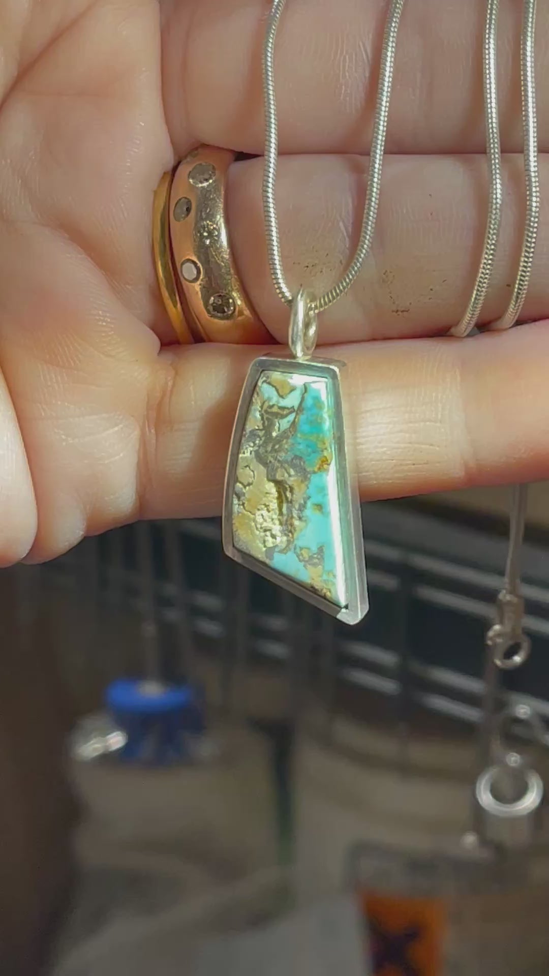 The understated satin finish contrasts beautifully with the turquoise tones and is effortlessly wearable on a sleek snake chain. For those who identify as a chap, chain lengths of around 22 inches or longer tend to work best. You’re welcome to specify your preferred length— the standard stock chain is 22 inches