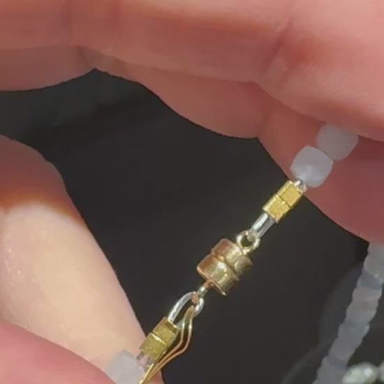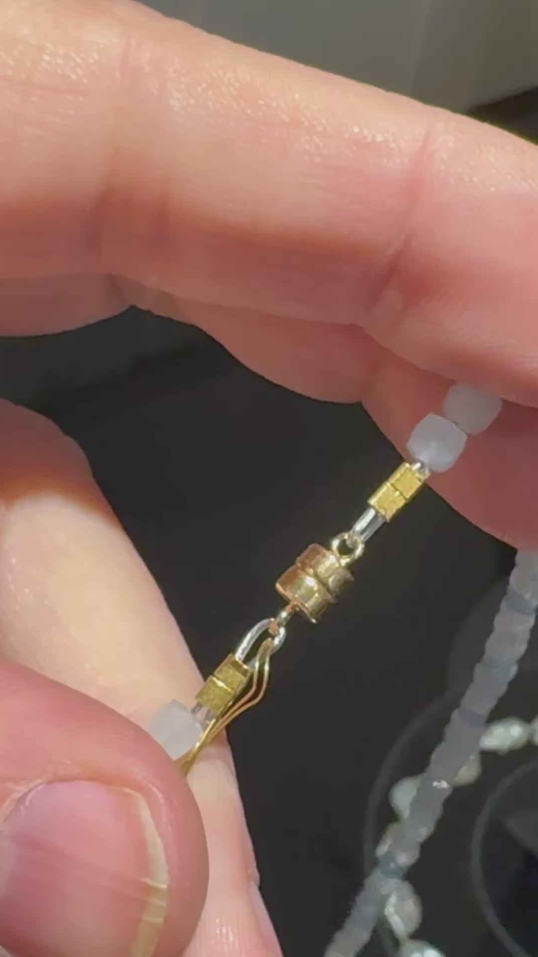 Check out the video to see these cute hand faceted Aquamarine’s sparkle. And contrast with the warm silver-gilt textured circle detail bead.. on gold-filled magnetic clasp. This one is 17 inches.