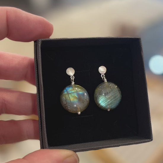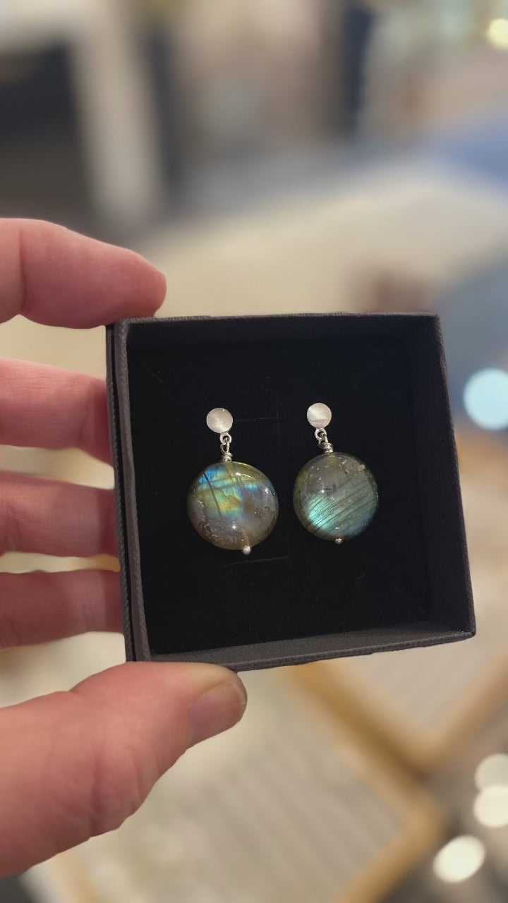 These polished Labradorite coins are hung from stylish brushed sterling sliver studs. Ideal for capturing the various colours that reveal themselves when they move.