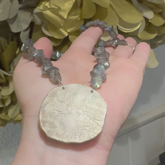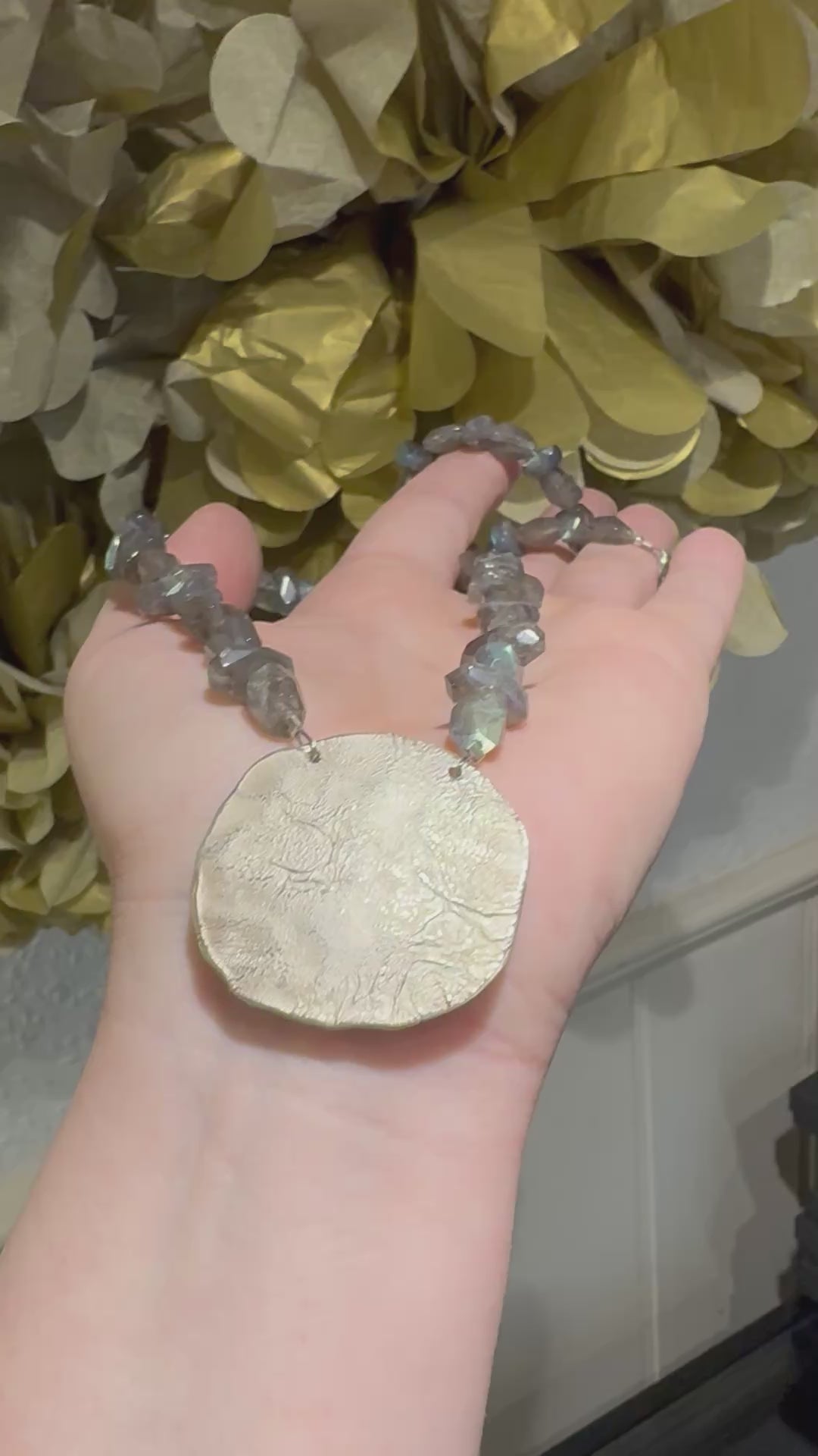 Love me some high grade Labradorite .. this strand of free form faced beads is set with my signature large, stunning domed sterling silver reticulated disc. The hook clasp is a doddle to use & the overall length is 19 inches.