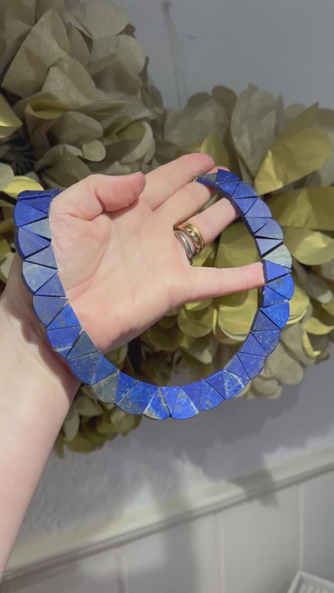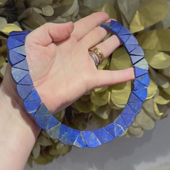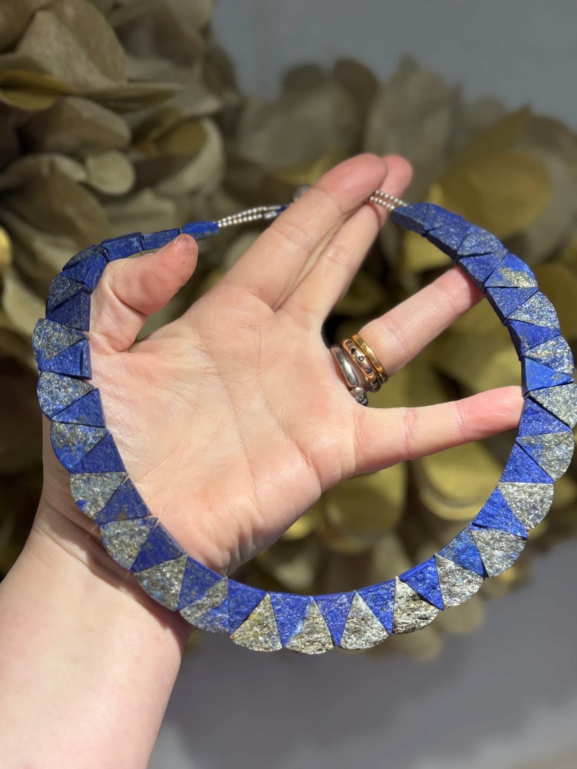 Lapis Lazuli is a natural companion to Pyrite (often called fool’s gold). In this necklace, each hand-cut bead is shaped to lie beautifully flat, revealing the Pyrite inclusions that naturally form alongside the Lapis.