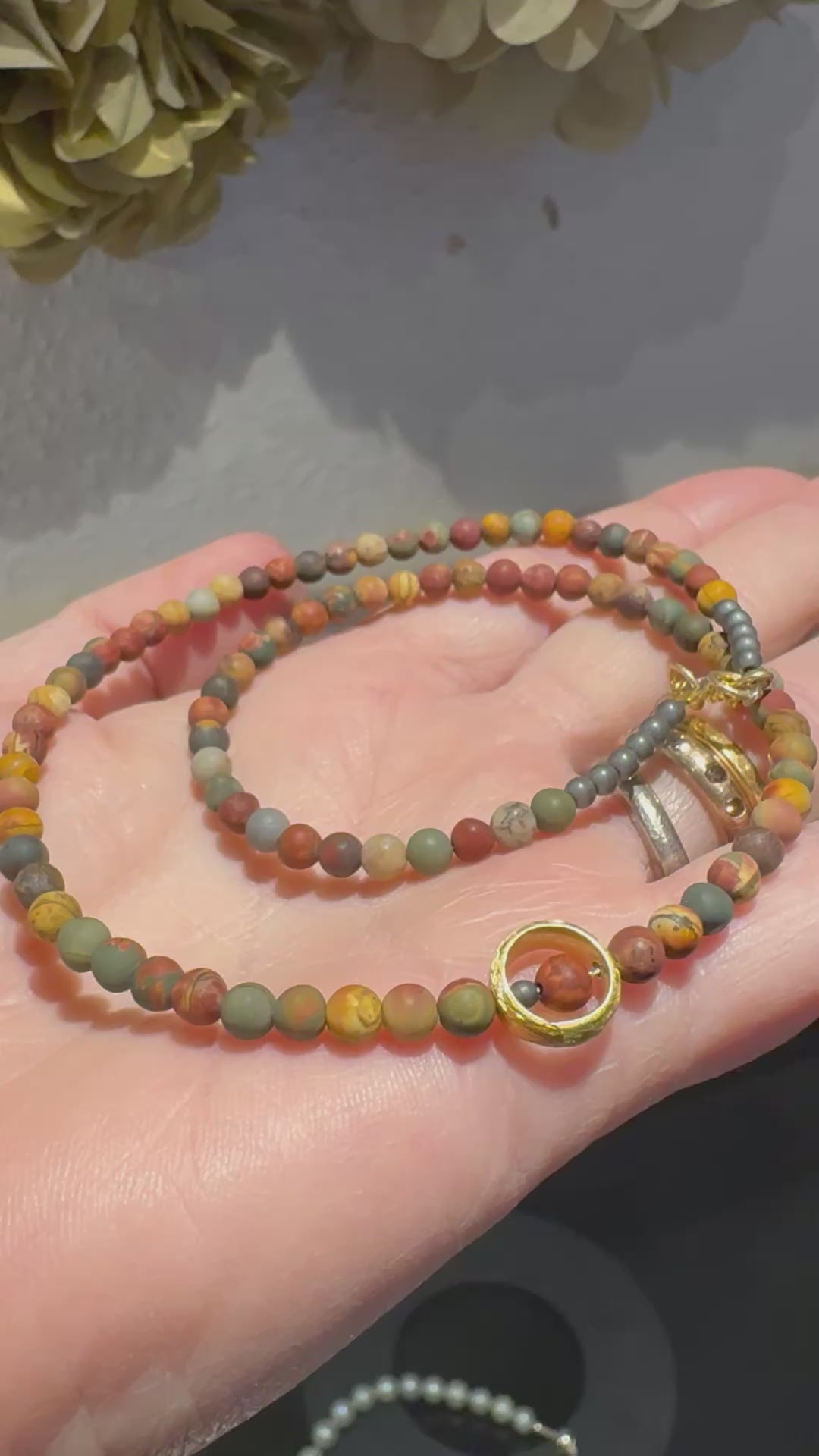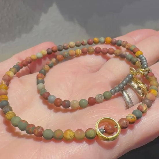 Matt Autumn Jasper 4mm round bead silver gilt necklace.