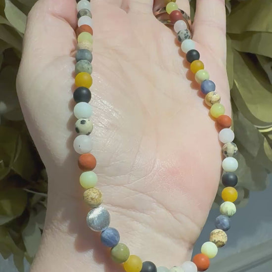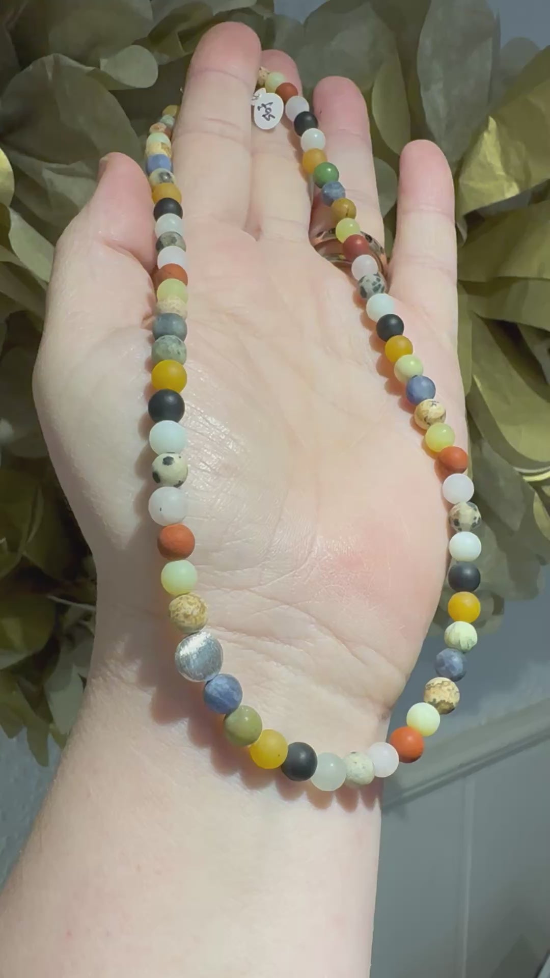 My most versatile & stylish range of matt finish, mixed gemstone beads. This one has a textured silver asymmetrical detail bead. It’s 17 inches long - often my clients happy length. See video for scale - each bead is aprox 6mm round.
