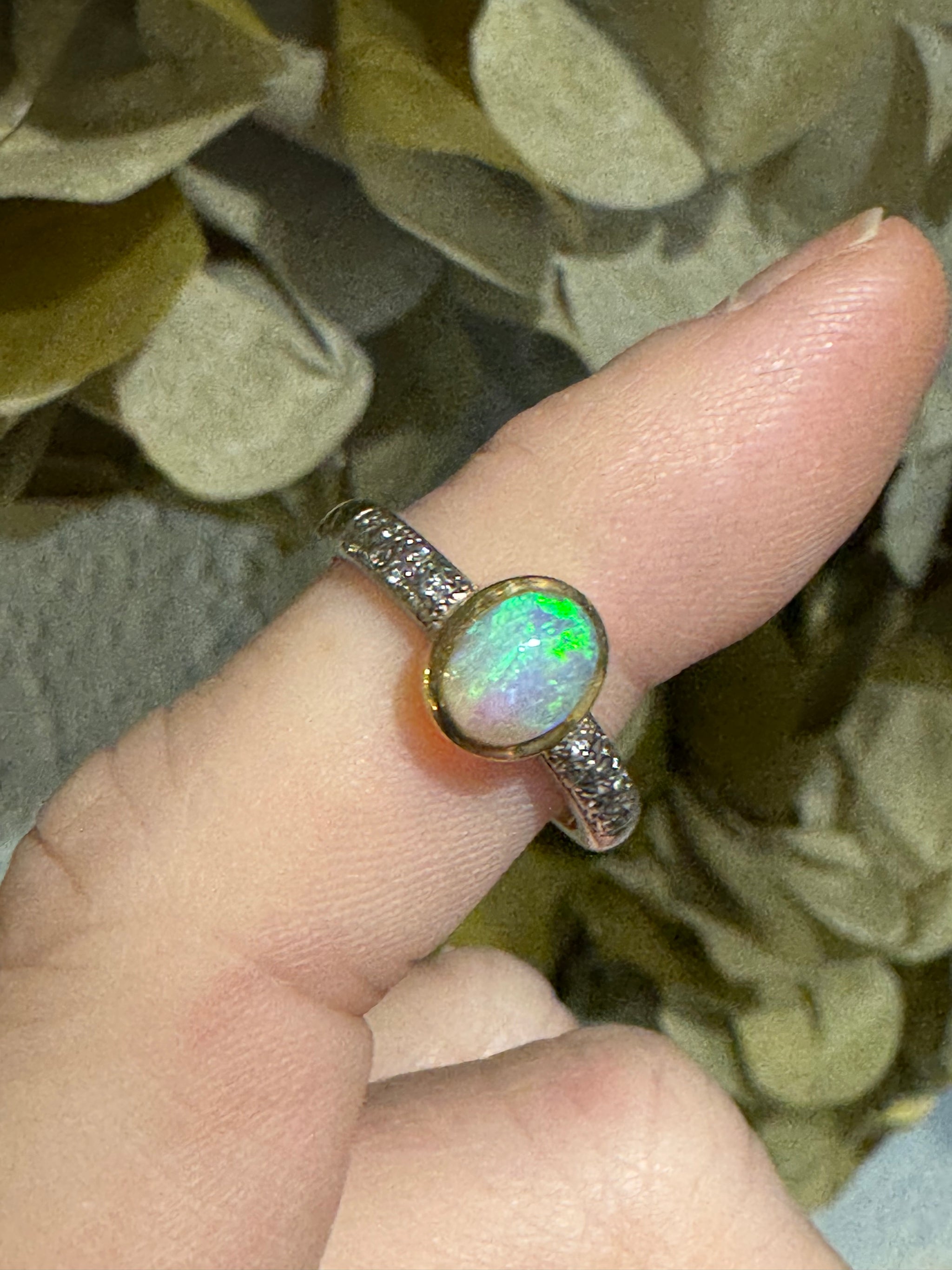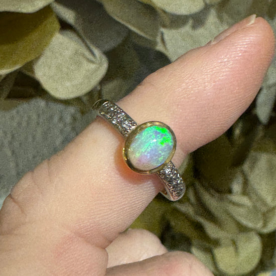 Opal doesn’t get much better than this.. my signature rub-over set oval Cabochon Australian Opal ring. Grain set with little white diamonds on the ring shank tops. All bespoke mounted in yellow and white 18ct gold.